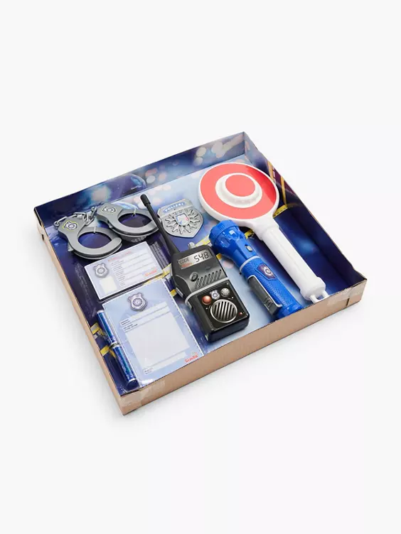 - Set bestehend aus 7 Teilen: Taschenlampe, Kelle, Handschellen, Polizeimarke, Strafzettel, Ausweis und Funkgerät